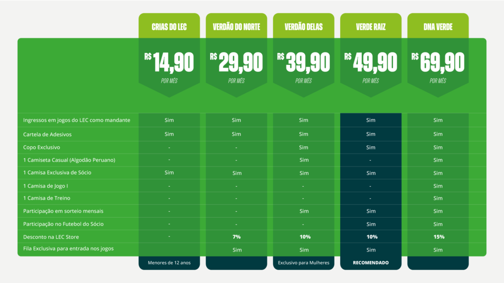 Crias do LEC – R$ 14,90/mês: Destinado a crianças até 12 anos, este plano é perfeito para formar a nova geração de torcedores Verdão do Norte. Focado em diversão e educação esportiva, os pequenos ganham ingressos gratuitos para jogos em família (acompanhados por um responsável), brindes infantis como adesivos coloridos, camisa exclusiva de Cria do LEC e prioridade de entrada com os atletas em dia de jogo. É a chance de plantar a semente do amor pelo LEC desde cedo, criando memórias inesquecíveis e incentivando o esporte como estilo de vida.